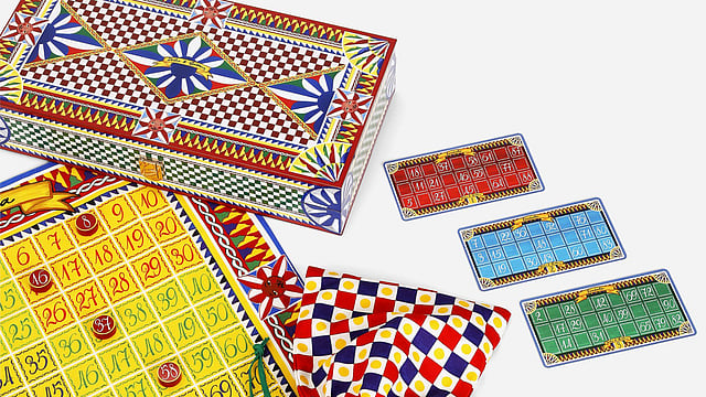 Not as global as dominoes, but a true Indian household staple. D&G leans into Tombola nostalgia with illustrated cards, cotton boards, patterned pouches for tokens and rich maximalist flair.