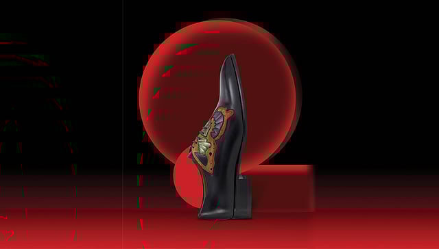 The Farfaman reworks a sharp pointed-toe silhouette with hand-cut panels of veau velours, iridescent lamb nappa, and multicoloured laminated leather forming a vivid butterfly.