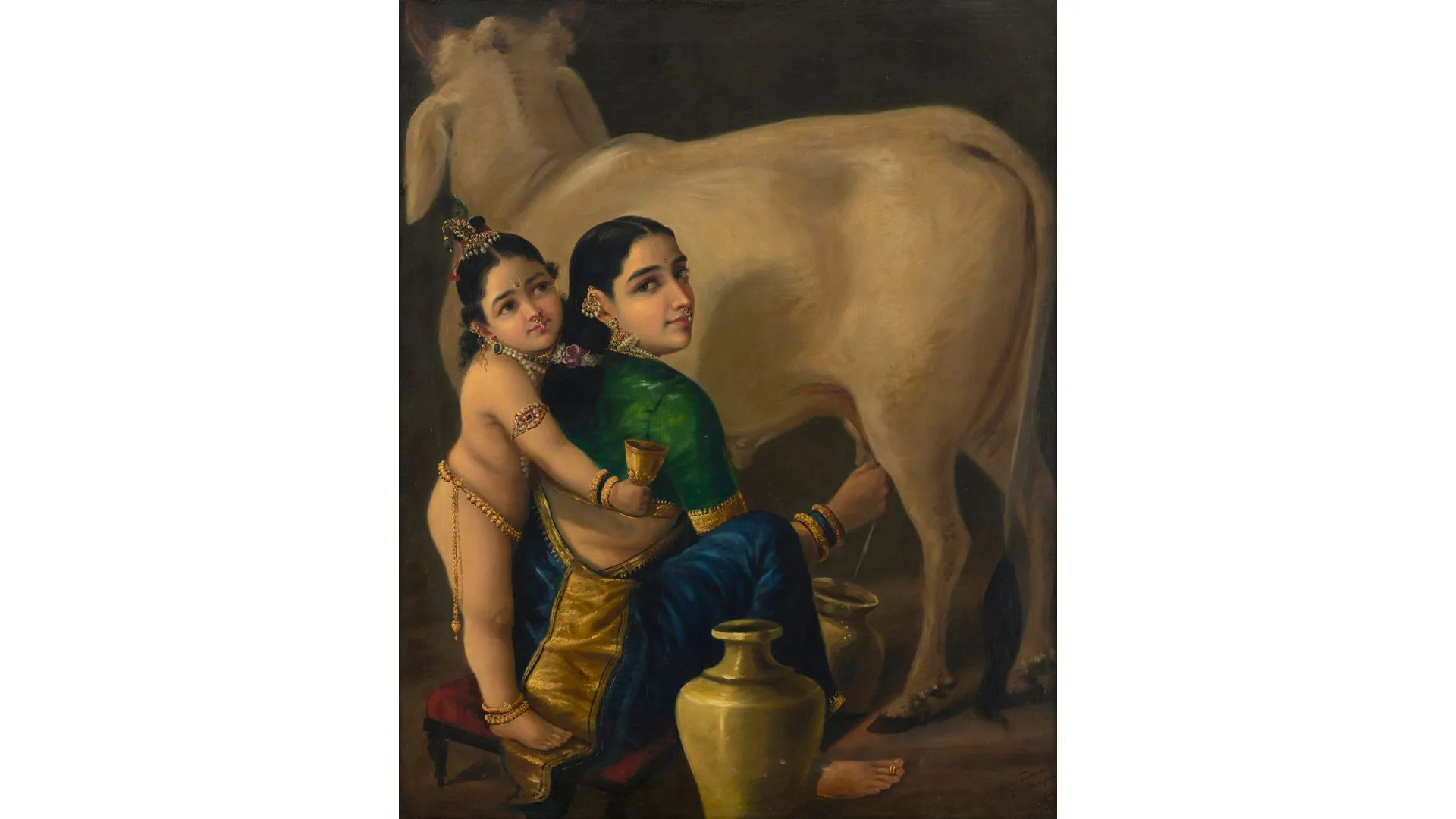 Yashoda and Krishna was painted in the 1890s, when Varma was at the height of his career. The oil on canvas depicts Yashoda milking a cow, with the infant Krishna approaching her for milk — a scene drawn from a specific stanza in the tenth book of the Shrimad Bhagavatam. Writer and collector Ganesh Shivaswamy, in the Saffronart catalogue, describes it as capturing the exact moment Yashoda, busy churning butter, is interrupted by the infant god seeking her attention.
