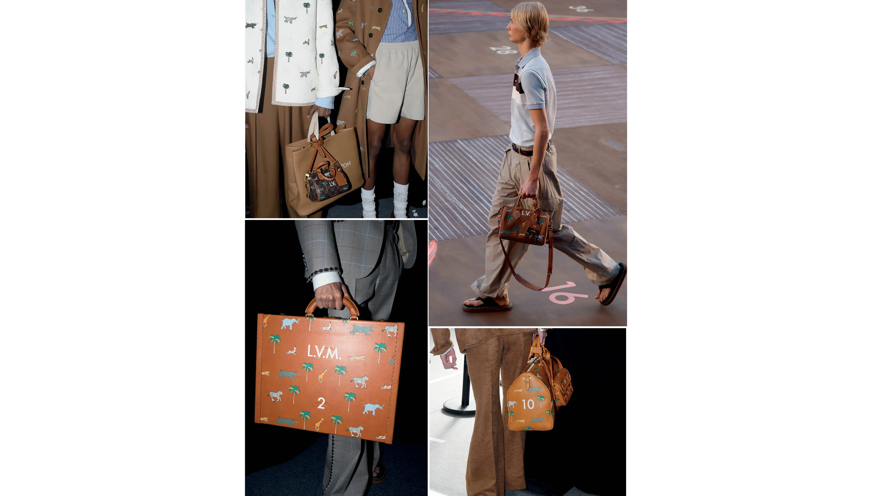 Nothing here feels preserved and that is precisely the point. At the centre sits dandyism, rewritten. Not ornamental but shaped by climate, movement and context. Louis Vuitton rarely indulges nostalgia, which is why the return of the Darjeeling Limited motif feels deliberate rather than sentimental. Originally created for Wes Anderson’s 2007 film, the tapestry of cheetahs, elephants, palms and roaming animals moves across leather and cloth as memory rather than motif. It appears on shirts, denim sets, tailoring and cashmere through embroidery and handwork that feels lived with, never precious.
